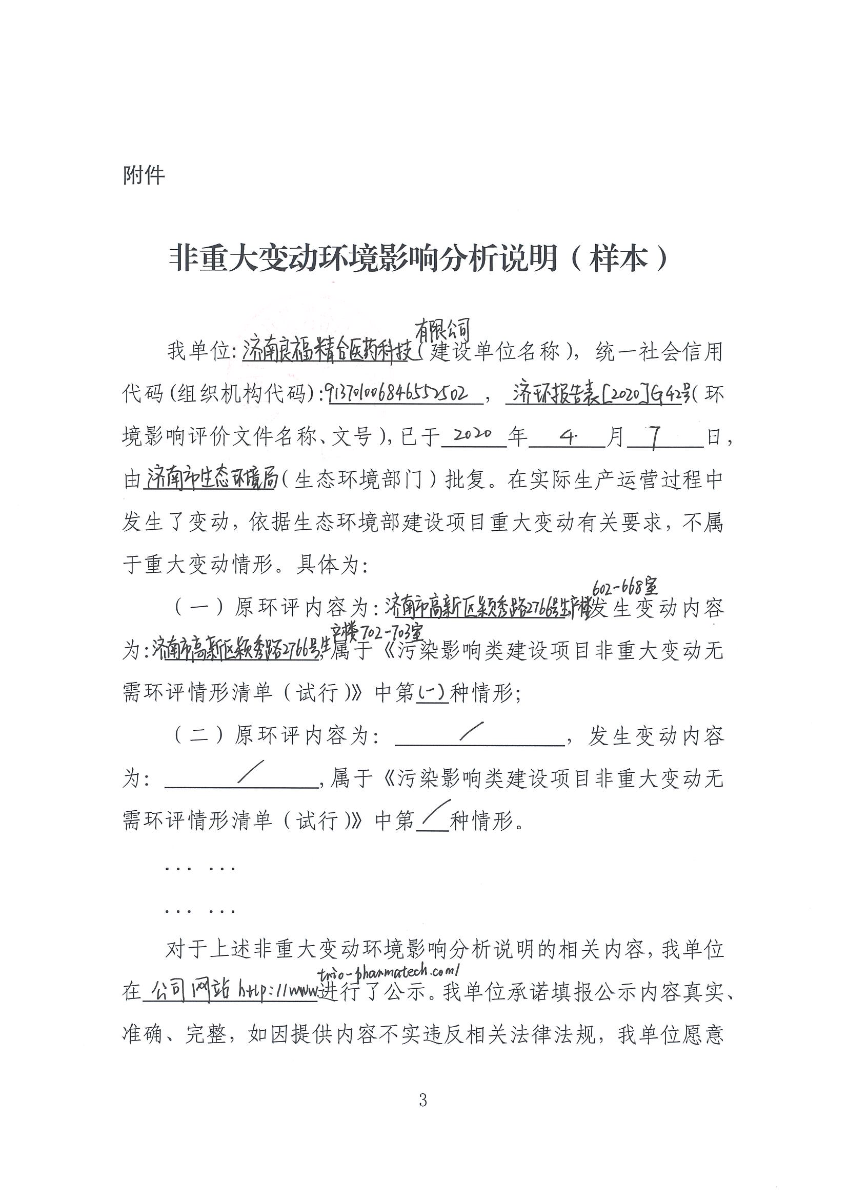 济南良福精合医药科技有限公司于2025年10月01日搬迁新址,根据《济南市生态环境局助企纾困服务高质量发展的20条措施》(济环发〔2022〕14号)有关规定,现将非重大变动环境影响分析说明(详见附件)予以公示。