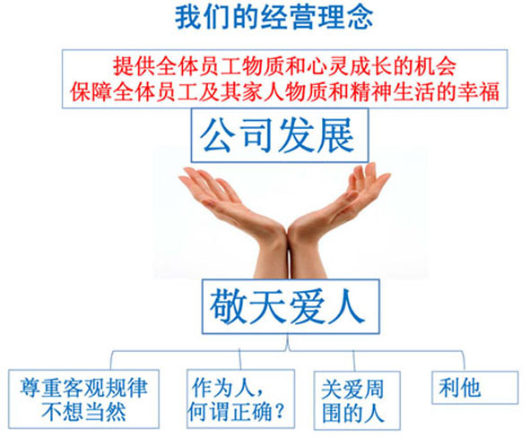 公司运营的第一要义是“提供全体员工物质和心灵成长的机会;保障全体员工及其家人物质和精神生活的幸福”,让每一位为了我们共同的事业辛苦工作的人及其家人及其家人终生受益,让每一位与我们合作的伙伴和客户体验“我为人人,人人为我” 的“Win-Win”经营理念。公司把这一经营理念贯彻落实到各项工作中,始终坚持 “敬天爱人”的哲学思想、“作为人,何谓正确?”的人生哲理,推动着公司快速发展。
