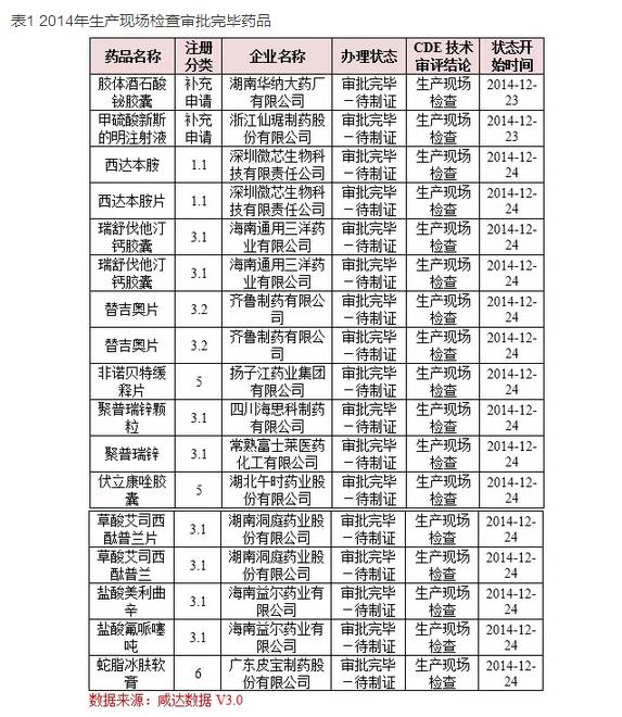 如表1所示,2014年有17个产品在12月24日左右生产现场检查完毕,“审批完毕-待制证”状态中,其中深圳微芯生物科技有限责任公司的1.1新药西达本胺及西达本胺片最受关注。此产品据说是我国首个获美国FDA核准在美国进行临床研究的中国化学原创新药,已完成美国I期临床试验研究。