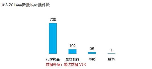根据咸达数据V3.0的最新统计(截止2014年12月31日),国家局更新最新的临床批文获批所对应的获批时间也是2014年12月25日,以状态开始时间是“2014年”统计,共868件临床批件获批。化学药品以730件临床批件排首位。生物制品共102件临床批件,其中治疗用生物制品70件临床批件,预防用生物制品32件。